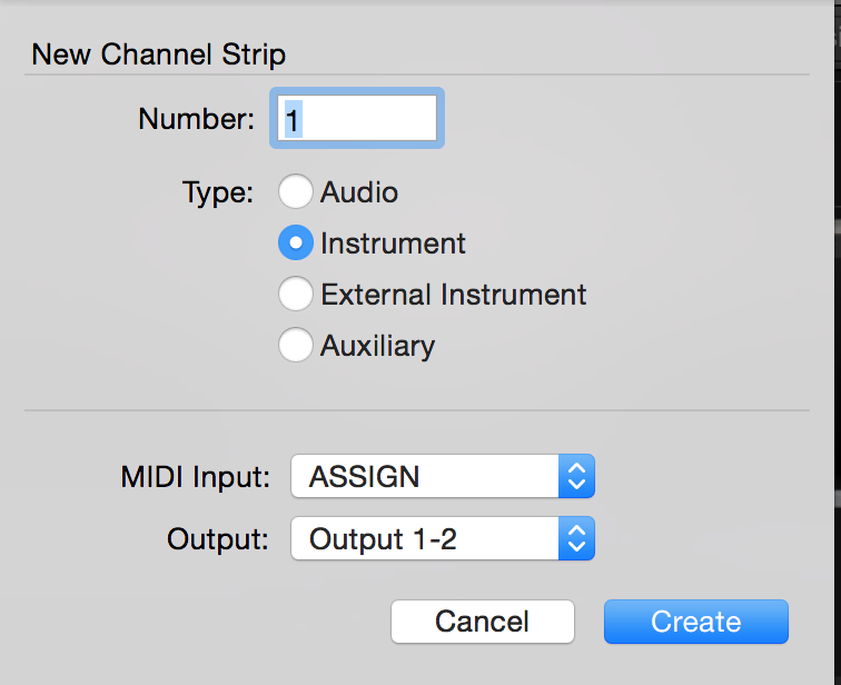 3. In the dialogue box, select instrument, pick your midi controller from the drop down menu, and make sure the output is 1-2.