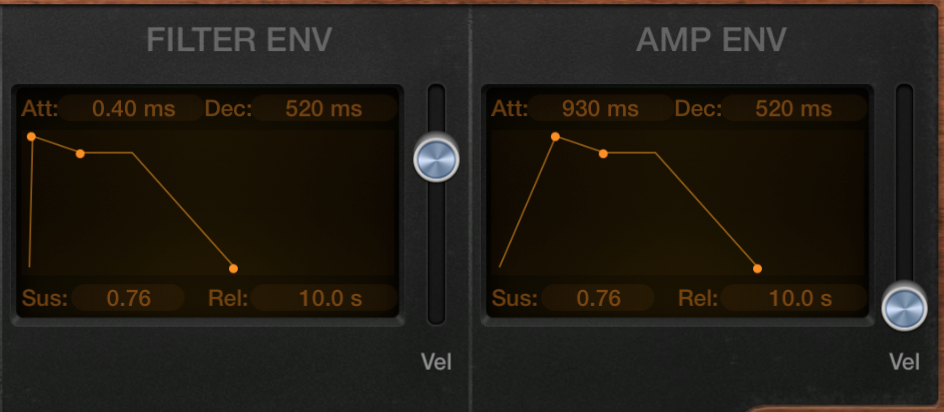 7. Move the Filter Env. and Amp Env. Release to the maximum length. Also, drag the little slider labeled Vel to zero.