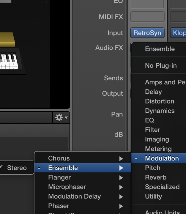 8. In the channel strip on the right side of the window, insert Audio FX>Modulation>Ensemble.